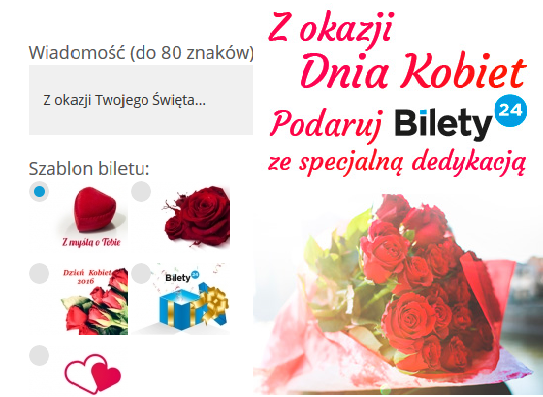 Dzień 8 marca jest wspaniałą okazją, by w szczególny sposób podkreślić postać kobiety. Dzień Kobiet to święto, które w Polsce nabrało rozgłosu w 1993 roku, jednak ustanowione zostało już w 1910 roku. Panowie w ten dzień szukają sposobów, by okazać kobietom jak bardzo są wyjątkowe. Platforma Bilety24 w odpowiedzi na takie zapotrzebowanie proponuje bogatą ofertę zobacz tutaj, wydarzeń kulturalnych, które zapewniają piękne chwile. Zachęcamy do zakupu biletu, z oryginalną, tematyczną grafiką oraz możliwością umieszczenia własnego tekstu. By skorzystać z takiego rozwiązania, należy wybrać opcję „bilet prezent”, następnie wybrać i zaznaczyć wybraną grafikę.