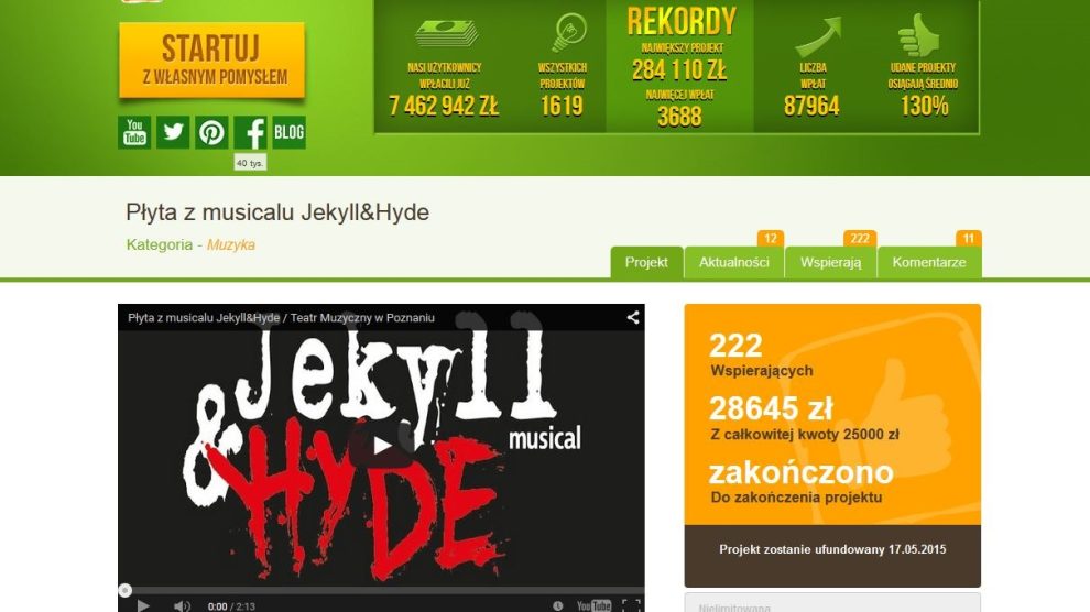 Wystartował projekt PŁYTA Z MUSICALU JEKYLL&HYDE na PolakPotrafi.pl Weź udział w projekcie, stań się współproducentem płyty Jekyll&Hyde Teatr Muzyczny w Poznaniu i wybierz dla siebie...