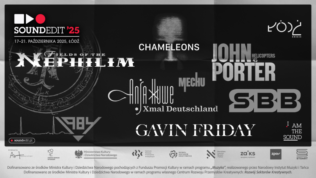 Tegoroczna edycja Międzynarodowego Festiwalu Producentów Muzycznych Soundedit jest naładowana wyjątkowymi koncertami. W łódzkiej Wytwórni wystąpią: Anja Huwe, czyli niegdyś głos zespołu Xmal Deutschland oraz Gavin Friday, który powróci na Soundedit po trzynastu latach. Pojawi się również łódzki artysta – Mechu. Następny dzień to kultowe Fields of the Nephilim wraz The Chameleons i polskim 1984. Festiwalowa niedziela to: John Porter, przypominający album „Helicopters” oraz SBB, które udowodni, że muzyczne granice nie istnieją. Soundedit odbędzie się w Łodzi już po raz 17. W dniach 17-21 października organizatorzy zapraszają na: warsztaty, prelekcje, spotkania, wystawy, koncerty. W niedzielę – 19 października – odbędzie się gala wręczenia nagrody Festiwalu Soundedit – statuetek „Człowieka Ze Złotym Uchem”. Program uzupełniają dwa dni bezpłatnych warsztatów – 20 i 21 października.
