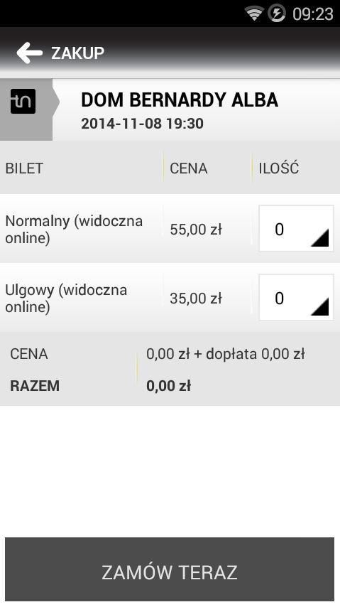 Można płacić za bilety przelewem bankowym albo kartą płatniczą. Płatność jest realizowana natychmiastowo. Po zakupie aplikacja pobiera bilet w formie QR kodu, który należy okazać obsłudze przy wejściu na spektakl.