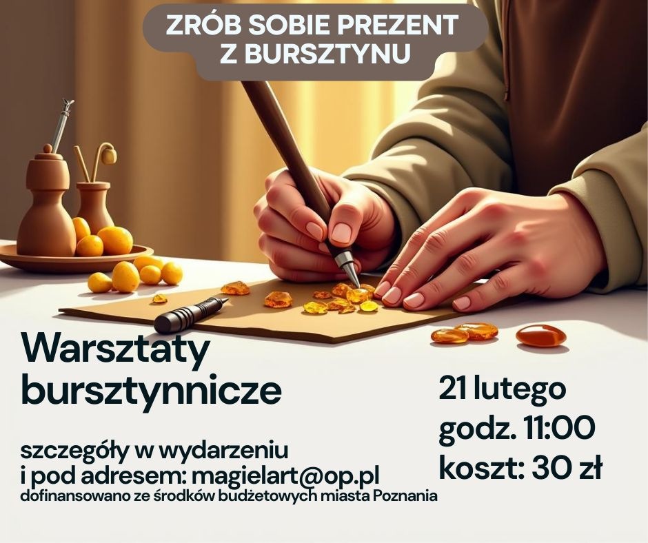 Warsztaty pachnące Bałtykiem, podczas których odkryjesz tajemnice zaklęte w bursztynie. 21 lutego, g. od 11:00 do 13:00, Magiel Artystyczny, Os. Zygmunta Starego 15a.*******