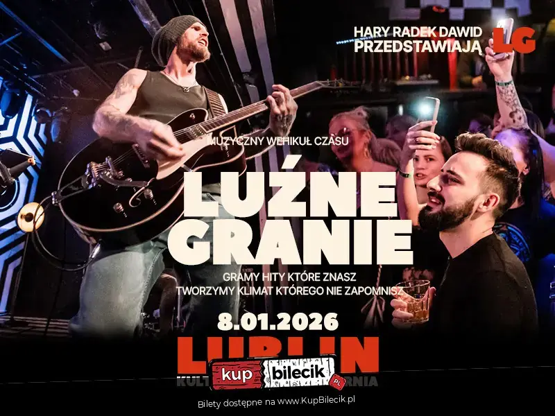 Lublin, szykujcie się na kolejny niezapomniany wieczór muzyczny w nowym roku! Wspólnie z Harym, Radkiem i Dawidem zapraszamy na wyjątkowe Luźne Granie - akustyczne spotkanie pełne energii, śpiewu i najlepszych muzycznych klimatów! Usłyszycie znane i lubiane covery polskich i zagranicznych artystów, takich jak: Maanam, Dżem, Myslovitz, Organek, Lady Pank i wielu innych! To nie tylko koncert, ale przede wszystkim świetna zabawa, gdzie każdy poczuje się częścią muzycznego świata!