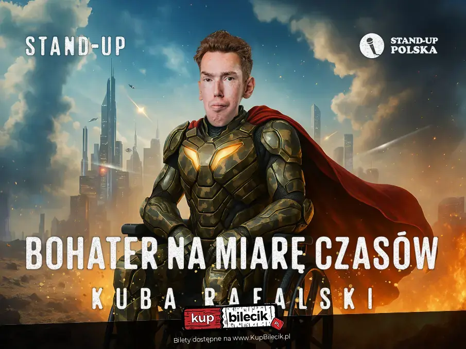 Niczym Zorro na swym koniu, niczym Gustlik w "Rudym 102", na swojej maszynie - dofinansowanej z PFRON-u - wjeżdża on: KUBA RAFALSKI w nowym programie komediowym. Uzbrojony po zęby w cięte riposty i wybuchowe puenty. Odporny na miny przeciwpiechotne i mandaty za stawanie na kopercie. BOHATER NA MIARĘ CZASÓW. Zapytany o stopień, odpowiada bez wahania: "Znaczny stopień niepełnosprawności." Przyjdź, zobacz i baw się... zanim zostanie kombatantem!