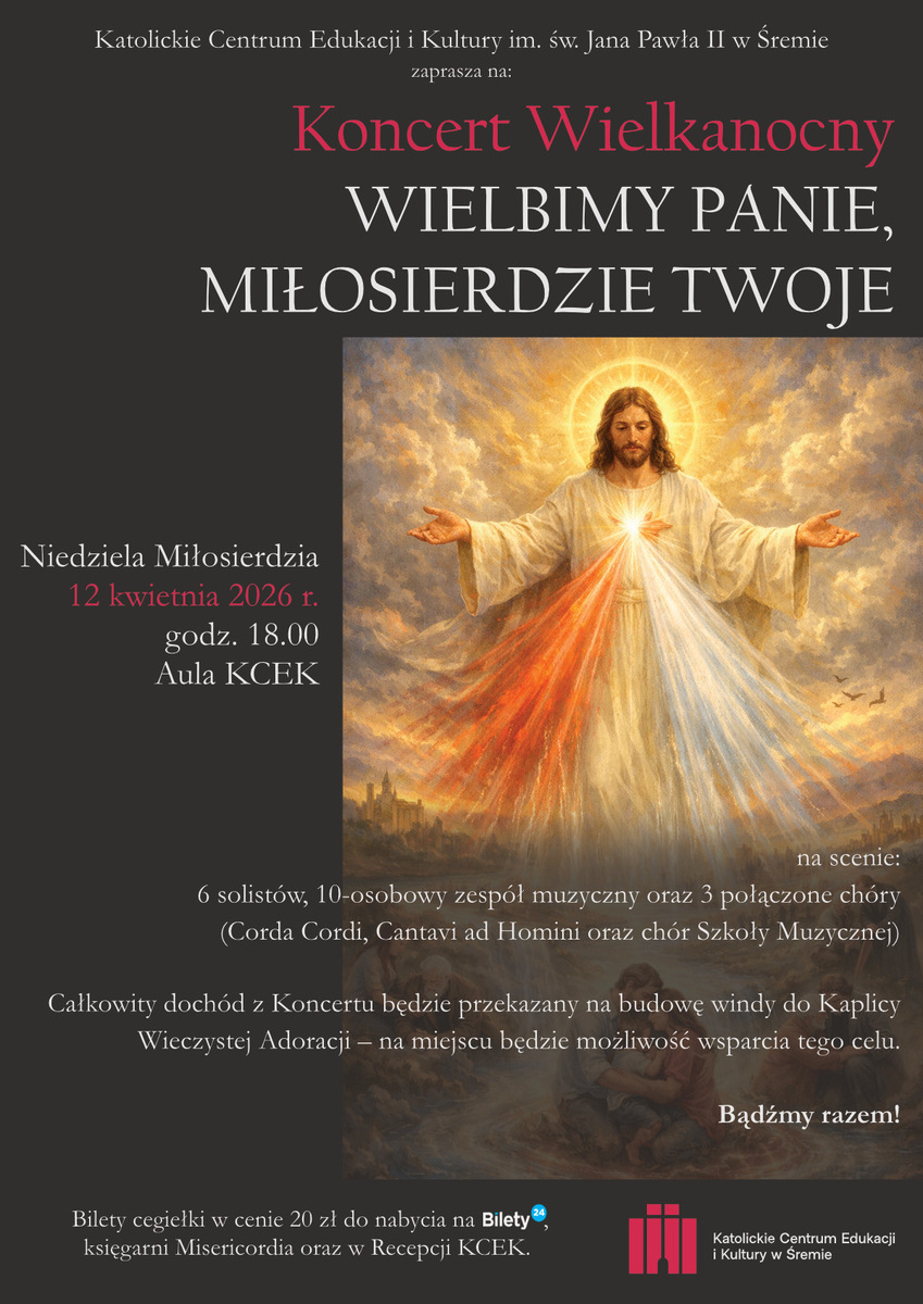Katolickie Centrum Edukacji i Kultury zaprasza na "Koncert Wielkanocny: WIELBIMY PANIE, MIŁOSIERDZIE TWOJE" Na scenie 10-osobowy zespół muzyczny, 6 solistów oraz 3 połączone chóry (Corda Cordi, Cantavi ad Homini oraz chór Szkoły Muzycznej). Bilety cegiełki w cenie 20zł. Całkowity dochód z koncertu będzie przekazany na budowę windy do Kaplicy Wieczystej Adoracji. Bądźmy razem w Niedzielę Miłosierdzia!*******