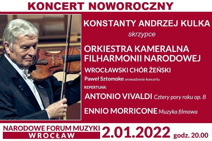 KONCERT NOWOROCZNY "VIVALDI - MORRICONE " W pierwszej części koncertu usłyszymy najbardziej znaną i lubianą kompozycję Antonia Vivaldiego – Cztery pory roku op. 8 – w mistrzowskim wykonaniu profesora Konstantego Andrzeja Kulki, który w Gdańsku sześćdziesiąt dwa lata temu, dokładnie 25 listopada 1959 roku, jako dwunastoletni wirtuoz zagrał swój pierwszy solowy recital skrzypcowy. Towarzyszyć mu będzie Orkiestra Kameralna Filharmonii Narodowej pod dyrekcją Jana Lewtaka oraz klawesynistka Danuta Kojro-Pawulska. W drugiej części zabrzmią dzieła mistrza muzyki filmowej Ennio Morricone w opracowaniu Jana Lewtaka, który wykona je z solistami oraz Orkiestrą Kameralną Filharmonii Narodowej (w tym roku artyści wydali płytę z muzyką filmową...