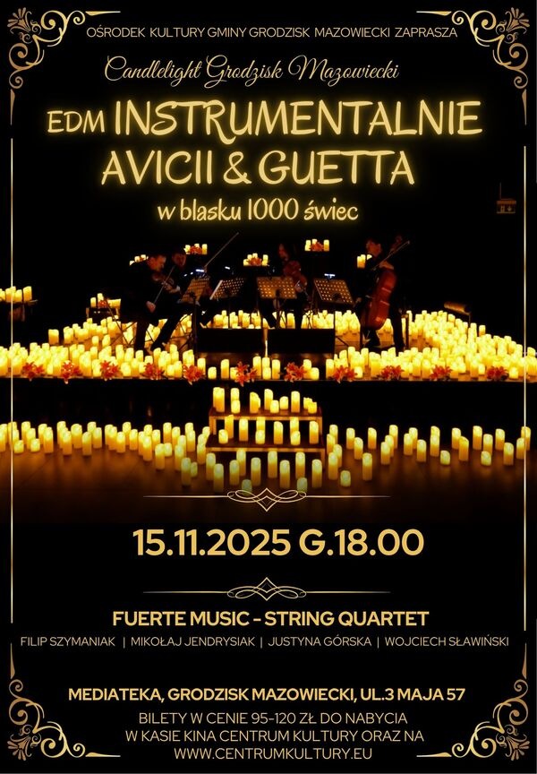 Zapraszamy na wyjątkowy wieczór pełen emocji i niepowtarzalnych brzmień! Kwartet Smyczkowy Fuerte zabierze Państwa w muzyczną podróż do świata elektronicznych hitów w stylu EDM – w instrumentalnych aranżacjach utworów takich artystów jak Avicii i David Guetta. To niezwykłe połączenie energetycznej muzyki klubowej z subtelnym, kameralnym brzmieniem instrumentów smyczkowych tworzy niepowtarzalny klimat — jednocześnie poruszający i pełen mocy. Koncert odbywa się w wyjątkowej atmosferze cyklu Candlelight, w blasku setek świec, co nadaje całości niezwykle nastrojowego charakteru.*******