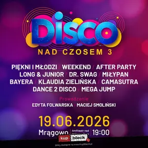 Taneczne rozpoczęcie lata w Mrągowie! Trzecia edycja Disco nad Czosem nadchodzi w nowej, bogatszej odsłonie! Na scenie słynnego mrągowskiego amfiteatru zobaczycie takich artystów jak: Piękni i Młodzi, Weekend, After Party, Long & Junior, Dr. Swag, MiłyPan, Klaudia Zielińska, Bayera, Camasutra, Dance 2 Disco, Mega Jump.