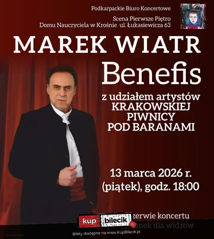 Zapraszamy na koncert artysty, śpiewaka i malarza Marka Wiatra z okazji jubileuszu pracy artystycznej. Benefis z udziałem kolegów artystów Krakowskiej Piwnicy pod Baranami.