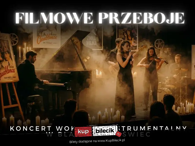 Everlight Concerts zaprasza Cię na magiczny wieczór przy blasku 1000 świec - pełen emocji, wspomnień i niezapomnianych melodii z wielkiego ekranu. "Filmowe przeboje - od klasyki do rocka" to klimatyczny koncert, podczas którego największe hity muzyki filmowej zabrzmią w nastrojowych, akustycznych aranżacjach. Blask setek świec, wyjątkowa atmosfera oraz poruszające interpretacje sprawią, że poczujesz się jak bohater ulubionego filmu. Na scenie wystąpi Everlight Band - zespół, który łączy emocjonalny wokal z brzmieniem fortepianu, gitary basowej, perkusji oraz skrzypiec. Dzięki tej eleganckiej obsadzie instrumentalnej znane filmowe tematy zyskują nową głębię, świeżość i niezwykłą intymność. Każdy utwór staje się muzyczną opowieścią, prowadzącą słuchaczy przez świat kina, emocji i wspomnień.