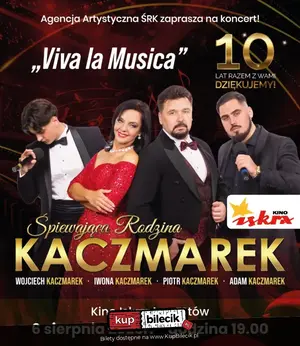 "Viva La Musica" to zupełnie nowy koncert jedynej w Polsce rodziny śpiewającej muzykę klasyczną. W wykonaniu Śpiewającej Rodziny Kaczmarek usłyszycie państwo tym razem najpiękniejsze melodie z operetki min. Wesołej wdówki, Hrabiny Marizy, Księżniczki Czardasza, czy Guditty, przeboje z musicali min: Skrzypka na dachu, My fair lady czy Upiora w operze, a także piękne standardy muzyki rozrywkowej, piosenki z repertuaru Franka Sinatry Elvisa Presleya, Poula Anki czy Luisa Armstronga. Iwona (sopran), Piotr (tenor), Adam (baryton) i Wojciech (baryton) przeniosą Państwa w cudowny świat muzyki, gdzie czekają na was niesamowite doznania emocjonalne. Piękna muzyka i wspaniałe głosy sprawią ,że będzie to niezapomniany wieczór. Zapraszamy!