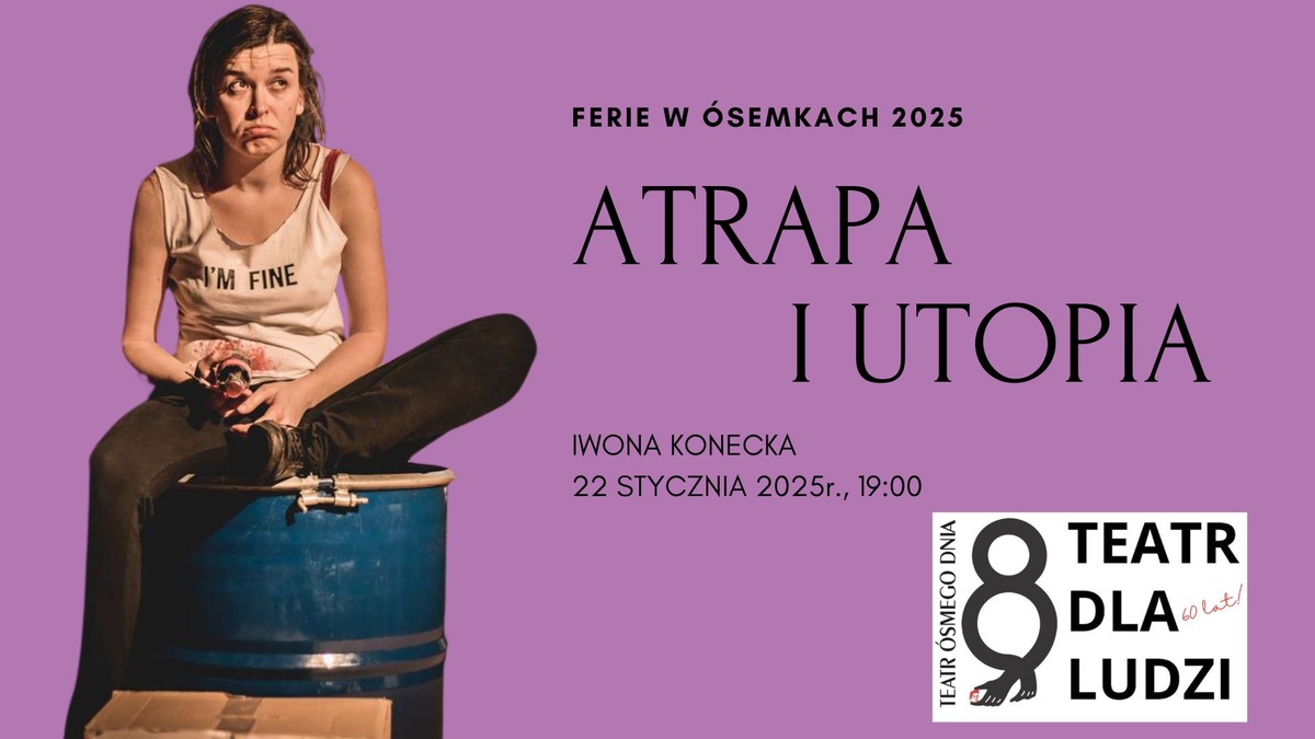 To wywód trochę już zmęczonej aktywistki, która co chwilę się poddaje, lecz poddać się nie może. W pseudo akademickiej formie wykłada widowni sens swoich działań, by za chwilę skontrować go poetycko-teatralnym obrazem. Dlatego „Atrapa i Utopia” to esej teatralny. Artystka szuka tematu w publicystyce i filozofii politycznej, a przede wszystkim w nowej polskiej poezji. To inspiracje, z których montuje teatralne metafory: zmienne i nieokiełznane, a wśród nich: sekwencje wybuchów, rockowe koncerty, trochę benzyny, a nawet Święty Mikołaj… Gdzieś między aulą wykładową a klubem go-go Iwona Konecka prowokuje odbiorców do odklejenia się od codzienności – udającej jedynie słuszną i nieuniknioną – i sięgnięcia wzrokiem w przyszłość. W zasadzie do różnych mniej lub bardziej możliwych przyszłości…