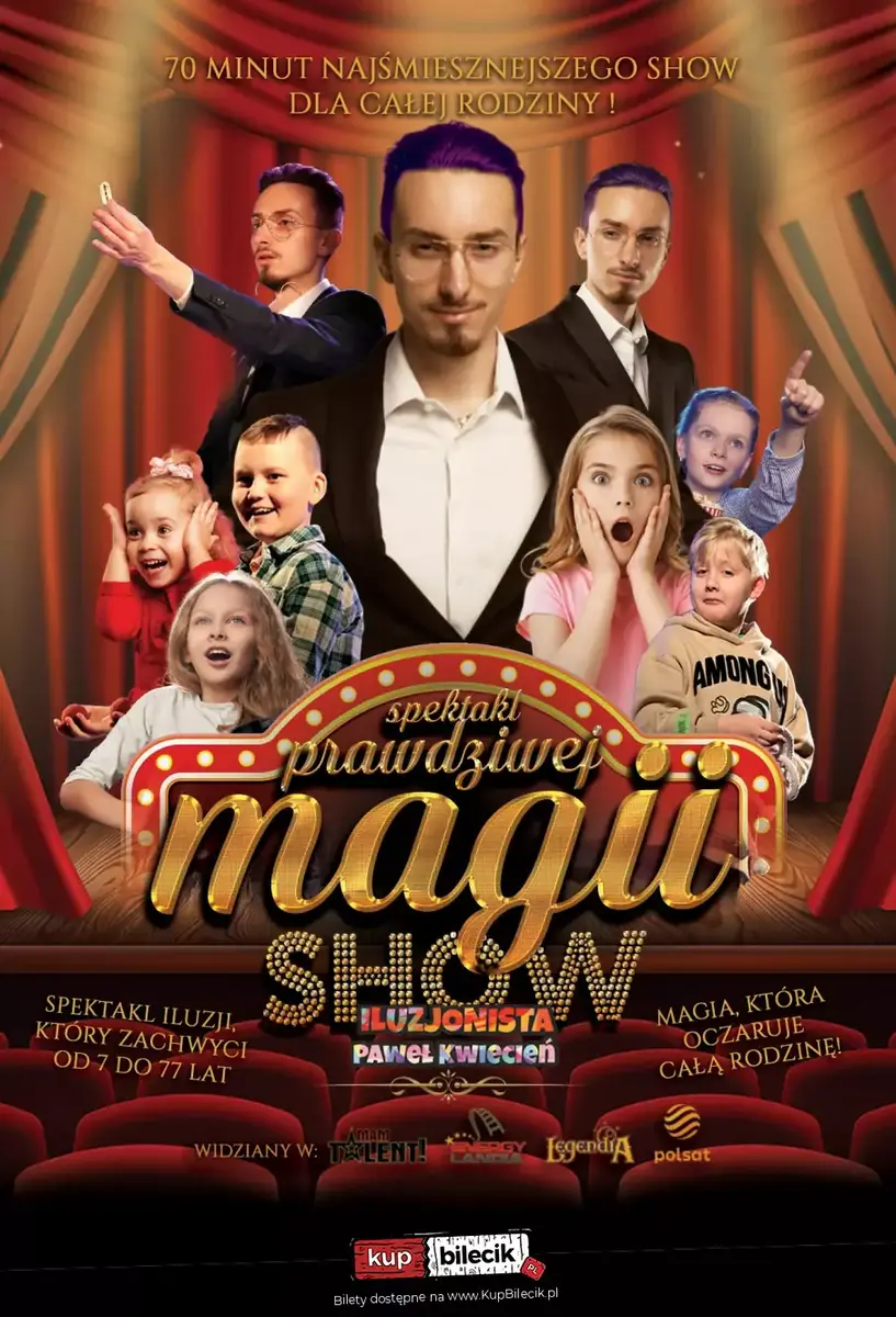 Przygotujcie się na 70 minut pełnych emocji, śmiechu i zaskoczeń. Paweł Kwiecień, iluzjonista, który na co dzień czaruje widzów po całej Polsce, zaprasza Was na show, które połączy magiczne iluzje z rodzinną atmosferą! To najśmieszniejsze magiczne show w Polsce - przeznaczone dla całych rodzin, które będą miały okazję poczuć się częścią tej niezwykłej przygody! Co czeka Was na spektaklu?