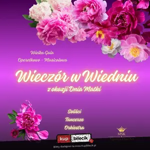 W programie zabrzmią najpiękniejsze walce, polki i arie operetkowe mistrzów wiedeńskiej klasyki, m.in. Johanna Straussa, Franza Lehára i Emmericha Kálmána. Pełne wdzięku melodie, elegancja wykonania i romantyczna atmosfera sprawią, że będzie to wieczór pełen wzruszeń, radości i niezapomnianych emocji. "Wieczór w Wiedniu", to doskonała okazja, by wspólnie uczcić Dzień Matki - podarować Mamom chwilę relaksu, piękna i muzycznej podróży w czasie. Ten koncert to wyraz wdzięczności, miłości i szacunku, zamknięty w dźwiękach ponadczasowej muzyki. Druga część koncertu zachwyci Państwa różnymi współczesnymi przebojami - od lat siedemdziesiątych do współczesności. Tego wieczoru zaśpiewają dla Was najlepsi soliści. Tancerze w olśniewających kreacjach przeniosą Państwa do magicznego świata muzyki i tańca. Przepych i beztroska, radość z muzyki, muzyczne żarty i niespodzianki stworzą niezapomniany nastrój. Wystąpią dla Państwa wybitni soliści sceny operowej i operetkowej. Serdecznie zapraszamy do wspólnego świętowania!