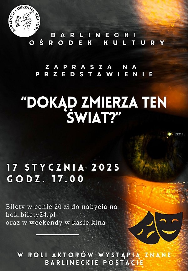 „Dokąd zmierza ten świat?” – BOK zaprasza na przedstawienie Barlinecki Ośrodek Kultury, zaprasza na przedstawienie „Dokąd zmierza ten świat?” 17 stycznia (piątek) 2025r. godz. 17.00, sala widowiskowa BOK, ul. Podwale 9. W oczekiwaniu na przyjście Chrystusa, nie zauważamy, że jesteśmy dla siebie mało życzliwi. Otacza nas brak uczuć, hejt i drwina z drugiego człowieka. W świecie pełnym pogardy, nie widzimy swoich błędów w relacjach międzyludzkich… W roli aktorów, wystąpią znane barlineckie postacie. Scenariusz i reżyseria Anna Adamiok. Bilety w cenie 20 zł do nabycia na bok.bilety24.pl i w weekendy w kasie kina „Panorama”. Przedstawienie dedtykowane jest od 15 roku życia.*******