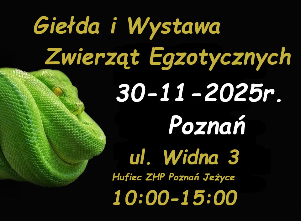 Wystawa Zwierząt Egzotycznych Giełda Terrarystyczna Spotkanie terrarystów Miejsce - ul. Widna 3, 60-655 Poznań, Rozpoczynamy o godzinie 10:00 do 15:00 (wejście na bilety online do 14:00) Na wystawie, giełdzie można zobaczyć różne gatunki zwierząt: pająki, skorpiony, owady, gady i płazy a także zakupić karmę, rośliny, literaturę, akcesoria do hodowli, terraria, sprzęt terrarystyczny. Spodziewamy się wystawców i hodowców z całej Polski. Przyjdź, zobacz, poszukaj inspiracji i wybierz coś dla siebie. Porozmawiaj z hodowcami, posłuchaj o hodowli, występowaniu i warunkach. Wymień doświadczenia, nawiąż kontakty i poznaj nowe gatunki zwierząt. Niedozwolone jest oferowanie na wystawie zwierząt niedopuszczonych w Polsce do obrotu a w przypadku zwierząt,...