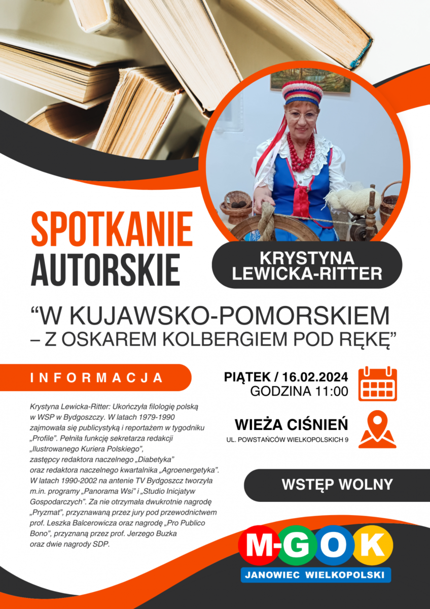 Pod patronatem Elżbiety Piniewskiej – Przewodniczącej Sejmiku Województwa Kujawsko-Pomorskiego w Janowcu Wielkopolskim odbędzie się spotkanie autorskie z red. Krystyną Lewicką-Ritter dziennikarką regionalistką, autorką książki pt: „W Kujawsko-Pomorskiem – z Oskarem Kolbergiem pod rękę”. W październiku 2023 roku w konkursie toruńskiej Książnicy Kopernikańskiej książka otrzymała Nagrode specjalną Marszałka województwa Kujawsko-Pomorskiego oraz tytuł „Najlepszej Książki o Tematyce Regionalnej wydanej w 2022 roku w kategorii KULTURA”
