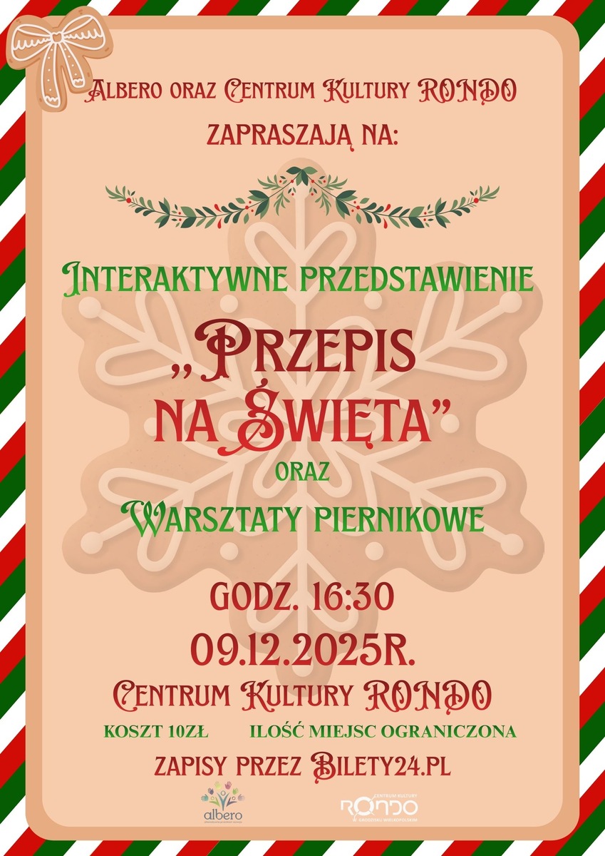 Gotowi na odrobinę świątecznej magii? Albero wraz z Centrum Kultury RONDO zapraszają na interaktywne przedstawienie „Przepis na Święta” połączone z warsztatami piernikowymi! Idealna okazja, żeby poczuć klimat zbliżających się Świąt i spędzić popołudnie w kreatywny sposób.*******