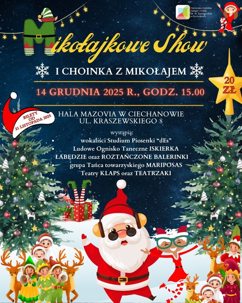 Zbliża się czas spotkań ze św. Mikołajem Zapraszamy wszystkich w niedzielę, 14 grudnia, o godz. 15.00 na mikołajkowe widowisko podczas którego zaprezentują się grupy działające w PCKSz: Studium Piosenki "dEs" Ludowe Ognisko Taneczne „ISKIERKA" grupy baletowe „Roztańczone Balerinki”, „Łabędzie” grupa tańca towarzyskiego MARIPOSAS Teatry "KLAPS" i "TEATRZAKI" Seniorzy z Powiatowego Uniwersytetu Trzecieko Wieku Na zakończenie artystycznych występów odbędzie się wyjątkowe spotkanie i zabawa ze św. Mikołajem To będzie wyjątkowy czas tańca i śpiewu dla całych rodzin ---------------------------- WAŻNA INFORMACJA Bilety do nabycia już od tego piątku, 21 listopada 2025 r. od godz. 16:00 tylko w kasie Kino Łydynia w siedzibie Szkoła Podstawowa TWP przy...