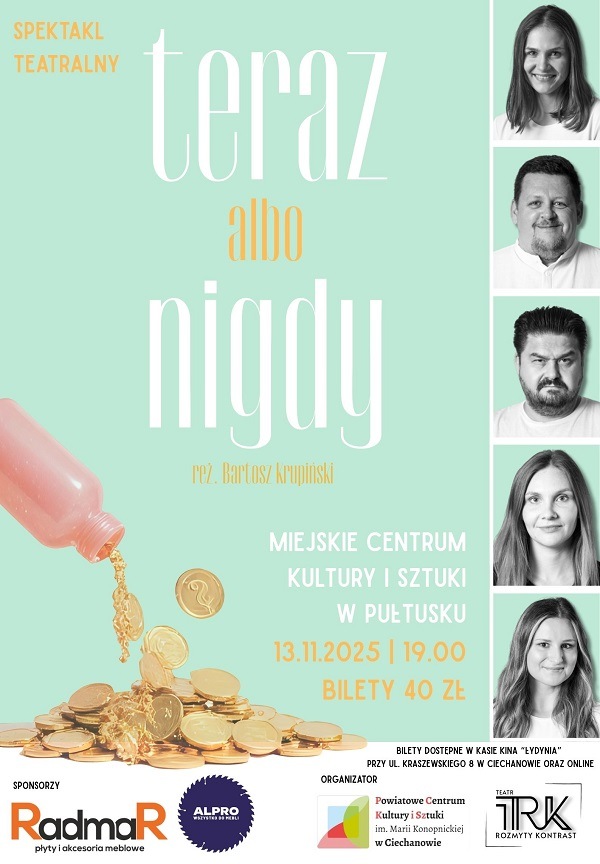 TERAZ ALBO NIGDY to widowiskowa i pełna zwrotów akcji komedia, która w błyskotliwy i lekki sposób obnaża absurdy współczesnego świata. Wartka akcja, znakomite dialogi i ogromna dawka humoru sprawiają, że spektakl od pierwszej do ostatniej minuty trzyma w napięciu i nieustannie zaskakuje. Historia opowiada o pozornie idealnym małżeństwie właścicieli dużej firmy – pięknych, bogatych i… kompletnie niedopasowanych. Gdy ona postanawia odmienić swoje życie, on knuje plan, by jej to uniemożliwić. Seria nieoczekiwanych wydarzeń prowadzi do zaskakujących, czasem kryminalnych konsekwencji, a w konflikt wplątują się również barwni sąsiedzi, którzy dodają całej historii jeszcze więcej komediowego smaczku. OBSADA: Bartosz Krupiński Aleksandra Barańska Michał...