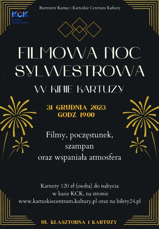 To będzie noc dobrego kina i sylwestrowej atmosfery. Chcesz być pierwszym, który zobaczy wyjątkowe filmy w przedpremierze. Zapraszamy na Filmową Noc Sylwestrową w Kinie Kartuzy. Pierwszy taki Sylwester w Kartuzach. Na ekranie plejada gwiazd, Więckiewicz, Gajos, Braciak, Simlat, Seweryn, Bielenia, Pazura, Stuhr, oraz piękne kobiety Agnieszka Grochowska, Kasia Sawczuk i Paulina Gałązka. Polskie i francuskie kino. Pokażemy filmy: Kos, Do usług Szanownej Pani oraz Fuks 2. W programie także poczęstunek i szampan. Powitaj Nowy Rok „na filmowo”. Burmistrz Kartuz i KCk zapraszają.