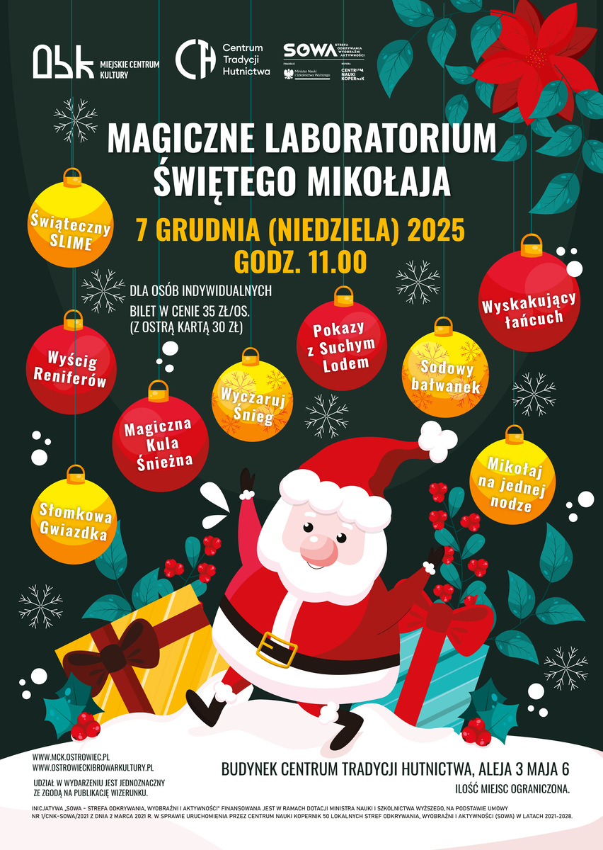LABORATORIUM ŚWIĘTEGO MIKOŁAJA W STREFIE SOWA Ho,Ho,hoo! Gotowi na przedświąteczną magię z prawdziwym przytupem? Zapraszamy wszystkie małe elfy (i ich duże elfy też) na wyjątkowe warsztaty, podczas których przeniesiemy się do zaczarowanego świata Mikołaja! Co na Was czeka? WYCZARUJEMY ŚNIEG -nawet jeśli za oknem ani płatka ZROBIMY WŁASNĄ KULĘ ŚNIEŻNĄ- potrząśnij i przenieś się do zimowej bajki MIKOŁAJ NA JEDNEJ NODZE- śmiech gwarantowany, równowaga niekoniecznie WYŚCIG RENIFERÓW - szybkie, szalone i pełne emocji A to dopiero początek....bo w Mikołajkowym laboratorium wszystko może się wydarzyć! Przyjdźcie, bawcie się, twórzcie i poczujcie prawdziwą moc świątecznej magii! ZAPISY TRWAJĄ - nie przegapcie tej świątecznej przygody Mile widziane czapki...