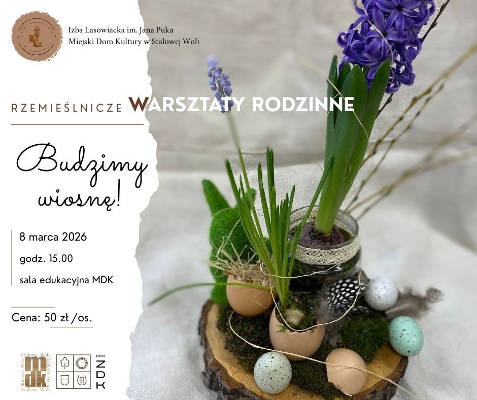 Wiosna nie przychodzi nagle. Budzi się powoli - w świetle dnia oraz zapachu ziemi i powietrza, które z dnia na dzień staje się lżejsze… Już 8 marca podczas naszych rzemieślniczych warsztatów rodzinnych przywołamy ją wspólnie i zaprosimy do swoich domów. Stworzymy stroik na naturalnym plastrze drewna - surowym, rustykalnym, z historią zapisaną w słojach. To właśnie on będzie sercem kompozycji, do której możesz dołożyć swój akcent. Jeśli chcesz, zabierz ze sobą nieużywaną filiżankę i daj jej drugie życie! Nasze spotkanie będzie czasem relaksu, rozmów i łagodnego wejścia w wiosenny nastrój. Liczba miejsc ograniczona. *W cenę wliczone są wszystkie materiały oraz narzędzia potrzebne w czasie warsztatów. *Bilety nie podlegają zwrotowi. *Prosimy,...