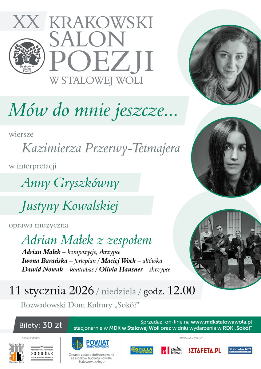 XX Krakowski Salon Poezji w Stalowej Woli „Mów do mnie jeszcze…” – wiersze Kazimierza Przerwy-Tetmajera Po raz dwudziesty spotkamy się na Krakowskim Salonie Poezji w Stalowej Woli, by… mówić jeszcze. Tym razem słowami Kazimierza Przerwy-Tetmajera, którego znać „osobiście, przyjąć go u siebie (…) należało do rywalizacji salonów, a jego ręką mieć napisany choćby krótki aforyzm – to już była zdobycz jakby nie z tego świata”. Tak o naszym styczniowym bohaterze pisał Adam Grzymała-Siedlecki – współczesny mu pisarz i krytyk literacki. Kazimierz Przerwa-Tetmajer swoimi utworami wyrażał uwielbienie dla sztuki jako najwyższego duchowego osiągnięcia jednostki. Dużą część jego dorobku stanowią wiersze nastrojem odwołujące się do pokoleniowego poczucia...