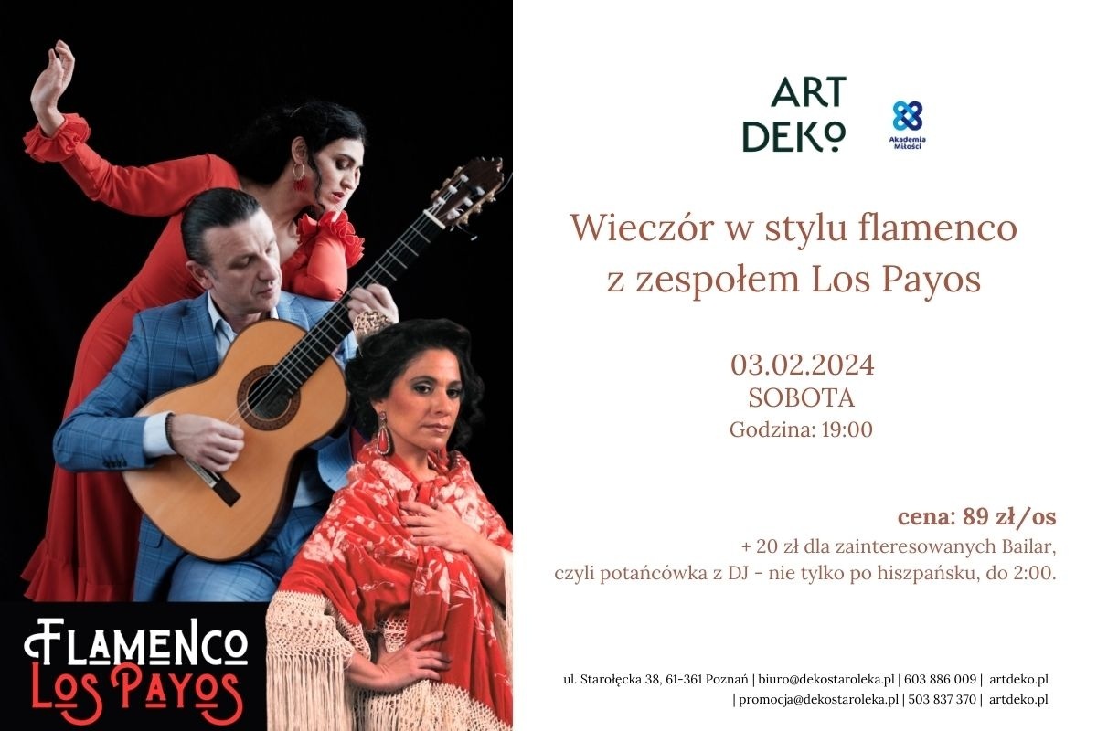 Zapraszamy na wyjątkowy wieczór w stylu flamenco - pełen pasji, rytmu i ekspresji. Po zakupie biletów prosimy o kontakt w sprawie uzyskania dalszych informacji na adres e-mail: biuro@dekostaroleka.pl W ramach nowego cyklu wydarzeń artystycznych w ArtDeko Poznań - Starołęka wystąpi dla Was znakomity polsko-hiszpański zespół Los Payos. Flamenco zazwyczaj ma na widzów efekt piorunujący. Przejmująca muzyka, finezja gitary, malownicze stroje, energia i ekspresja tancerzy wywołują wśród publiczności silne emocje i często prowadzą do owacji na stojąco. Gorącą atmosferę hiszpańskich _tablaos_będziemy chcieli przywołać u nas w Poznaniu za sprawą muzyki, tańca, a także hiszpańskiego wina i _tapas_.Grupa LOS PAYOS zyskała...
