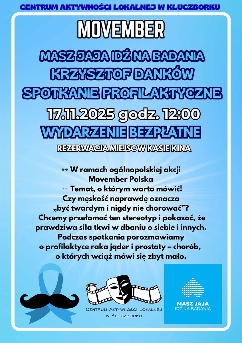 Centrum Aktywności Lokalnej w Kluczborku zaprasza na wyjątkowe spotkanie profilaktyczne prowadzone przez Fundację „Masz jaja – idź na badania!” w ramach ogólnopolskiej akcji Movember Polska Temat, o którym warto mówić! Czy męskość naprawdę oznacza „być twardym i nigdy nie chorować”? Chcemy przełamać ten stereotyp i pokazać, że prawdziwa siła tkwi w dbaniu o siebie i innych. Podczas spotkania porozmawiamy o profilaktyce raka jąder i prostaty – chorób, o których wciąż mówi się zbyt mało. To nie będzie suchy wykład, lecz inspirujące spotkanie z ludźmi, którzy z pasją i humorem uczą, jak troszczyć się o zdrowie. Fundacja „Masz jaja – idź na badania” udowodni, że rozmowa o zdrowiu może być otwarta, ciekawa i pełna energii! Dlaczego warto przyjść...