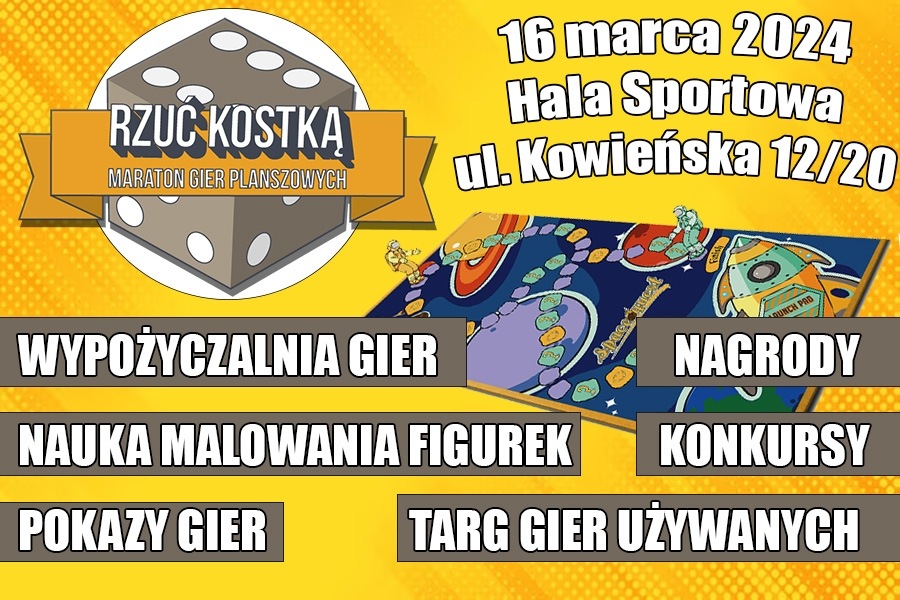 Rzuć Kostką to spotkanie fanów gier planszowych, gdzie w przyjaznej rodzinnej atmosferze gramy w planszówki. Czego możecie się spodziewać: - prezentów dla pierwszych 100 osób, które pojawią się na wydarzeniu, - pokazy gier organizowane przez wydawców, - wypożyczalnia gier, a w niej tytuły nowsze i starsze, - kącik malarski, zapewniamy figurki, farby, a po malowaniu, możecie zabrać figurki ze sobą, - co 3 godziny, rozdajemy planszówki! Targ gier używanych: - możecie przynieść swoje stare gry na specjalne stanowisko, zostawić je, ustalić cenę, a kiedy będziecie wychodzić, odbierzecie gotówkę, albo gry jeśli się nie sprzedadzą. Obowiązuje limit 5 gier na osobę. Miejsce, gdzie odbywa się Rzuć Kostką: Zapraszamy do hali sportowej blisko...
