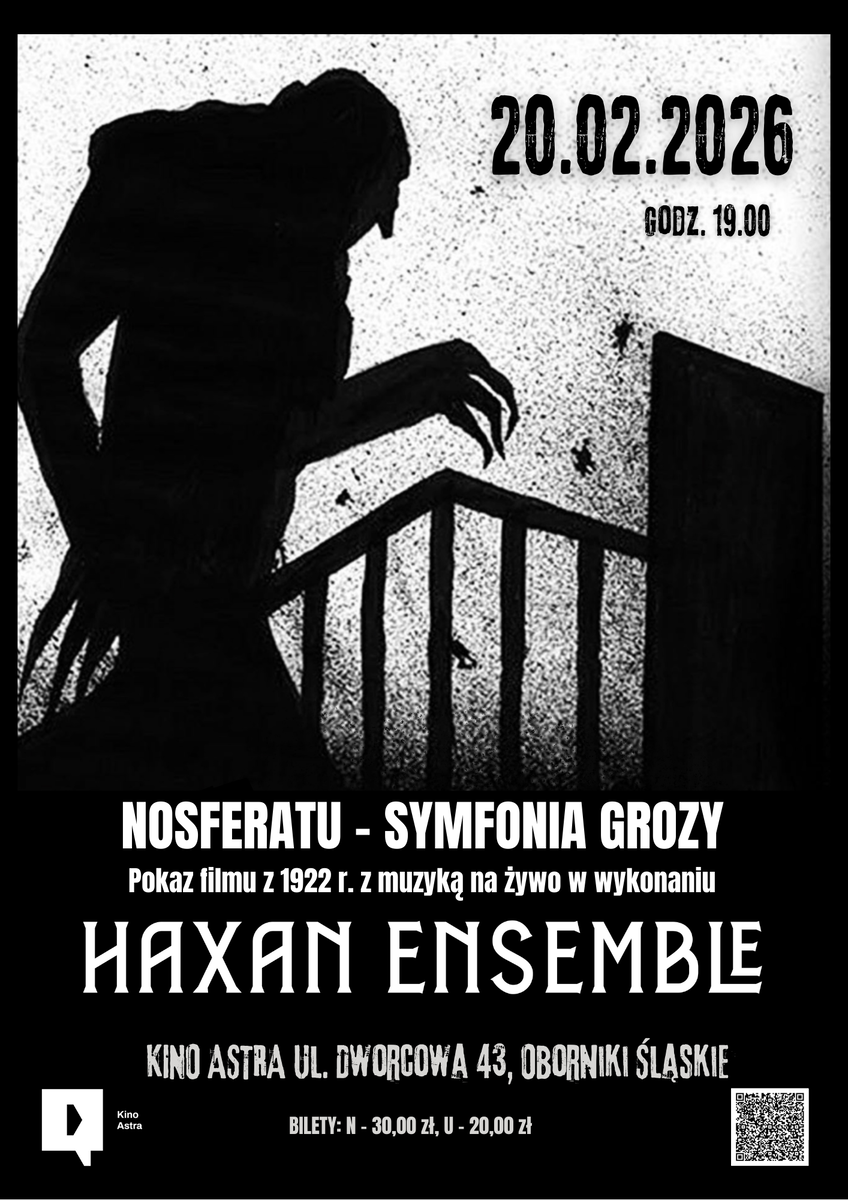 Zapraszamy na projekcję kultowego filmu niemego „Nosferatu – Symfonia Grozy” (1922, reż. Friedrich Murnau) z autorską muzyką wykonywaną na żywo przez Haxan Ensemble. Wisburg, rok 1838. Thomas Hutter, pracownik agencji nieruchomości, zostaje wysłany do Transylwanii, by tam sfinalizować transakcję z tajemniczym hrabią Orlokiem. Związane z tą podróżą złe przeczucia jego żony Ellen wkrótce się potwierdzają… Jeden z najważniejszych filmów niemieckiego ekspresjonizmu i jeden z pierwszych horrorów w historii kina. Za kanwę filmu posłużyła nieco zmodyfikowana (ze względu na problemy z prawami autorskimi) fabuła „Draculi” Brama Stokera. Rolę tytułowego Nosferatu odtwarzał Max Schreck. Haxan Ensemble – zespół składający się z czterech muzyków...