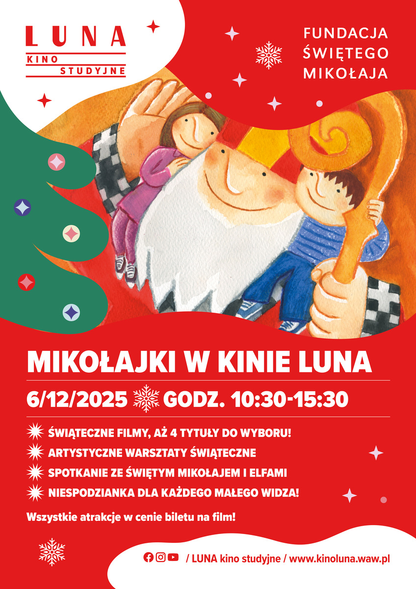 Razem z Fundacją Świętego Mikołaja zapraszamy do naszego kina na wyjątkowe pokazy filmowe, warsztaty w świątecznym klimacie oraz spotkanie ze Świętym Mikołajem a wszystko to w cenie biletu na film! To idealny sposób, by spędzić Mikołajki w rodzinnym gronie — łącząc kreatywne warsztaty, filmowe emocje i świąteczne ciepło. Gramy dla Was cały dzień: 11:15 – 12:35 Mysz masz na święta (1h20’) https://kinoluna.bilety24.pl/kup-bilety/?id=847249 12:15 – 13:08 Święta z Astrid Lindgren (53’) https://kinoluna.bilety24.pl/kup-bilety/?id=847252 13:00 – 14:30 Delfinek i Ja 2-przedpremiera (1h 30) https://kinoluna.bilety24.pl/kup-bilety/?id=847250 13:30 – 15:08 Zwierzaki na zakręcie (1 h38’) https://kinoluna.bilety24.pl/kup-bilety/?id=847253 15:00 –...