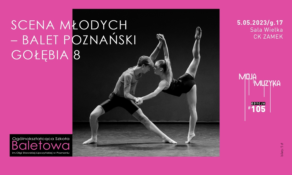 W ramach projektu Moja Muzyka zaprezentują się tym razem, ze swoimi choreograficznymi pomysłami, młodzi artyści baletu i tańca, uczniowie i uczennice Ogólnokształcącej Szkoły Baletowej w Poznaniu (ul. Gołębia 8). Niektórzy z nich prezentowali już swoje prace w ramach prestiżowego Międzynarodowego Konkursu Choreograficznego w Bytomiu. Dla innych będzie to pierwsza okazja do choreograficznego debiutu. Scena Młodych – Balet Poznański – Gołębia 8, to projekt będący efektem wieloletnich działań szkoły, która kształci nie tylko czynnych tancerzy czy odtwórców ról charakterystycznych dla spektakli baletowych, ale także twórczych artystów tańca, wypracowujących swoje własne koncepcje i tworzących oryginalne baletowe idee. To pierwsza taka spójna prezentacja pomysłów naszych młodych twórców w przestrzeni CK ZAMEK.