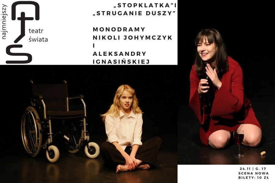 NAJMNIEJSZY TEATR ŚWIATA #1 - „Stopklatka” i „Struganie duszy” Typ:Teatr / taniec Miejsce: Scena Nowa Godzina: 17.00 Data: 24.11.2023 Cena: 10 zł zł Autorski projekt Piotra Dehra (prowadzącego dotychczas Pracownię Słowa i Poezji Śpiewanej) pt. „Najmniejszy teatr świata”, to cykl obejmujący spektakle teatrów jednego aktora, recytatorskie, koncerty poezji śpiewanej i piosenki autorskiej. Do realizacji projektów Piotr Dehr zaprosi artystki i artystów realizujących swoje pasje w poszczególnych dziedzinach. Podczas pierwszego wieczoru zostaną pokazane dwa monodramy: „Stopklatka” i „Struganie duszy”. Wykonawczynią pierwszego będzie Nikola Johymczyk, a drugiego Aleksandra Ignasińska. „Stopklatka” Maliny Prześlugi w opracowaniu...