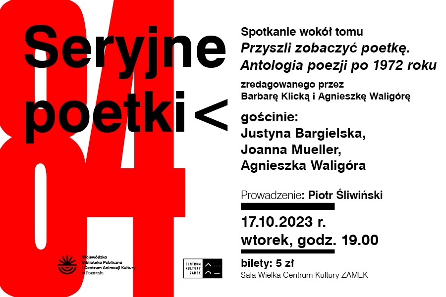 SERYJNE POETKISpotkanie wokół książki „Przyszli zobaczyć poetkę. Antologia poezji po 1972 roku” pod redakcją Barbary Klickiej i Agnieszki Waligóry TYP: LITERATURA MIEJSCE: SALA WIELKA Godzina: 19.00 Data: 17.10.2023 Cena: 5 zł gościnie: Justyna Bargielska, Joanna Mueller, Agnieszka Waligóra moderacja: Piotr Śliwiński Spotkanie transmitowane także na Facebooku CK ZAMEK i Zamek Czyta. Należałoby chyba zacząć od konstatacji od niedawna dopiero mogącej uchodzić za oczywistą: wiele osób identyfikujących się jako kobiety pisze. To, że ich twórczość jest różnorodna, rozległa i wielowątkowa czasem – choć szczęśliwie coraz rzadziej – wciąż umyka uwadze krytyków i badaczy. Joanna Orska w opublikowanym na łamach „Małego...