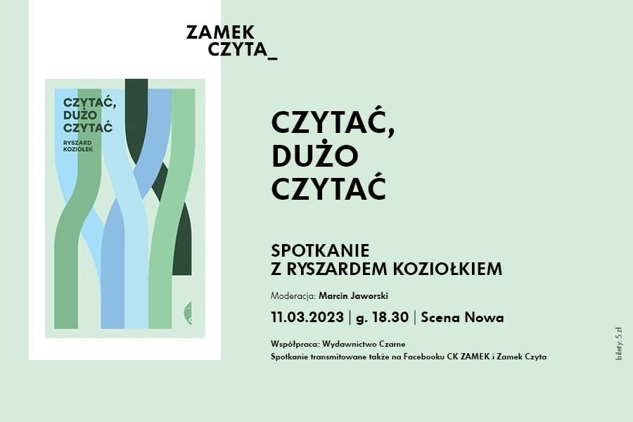 ZAMEK CZYTA / „Czytać, dużo czytać” (Wydawnictwo Czarne) – spotkanie z Ryszardem Koziołkiem MIEJSCE: SCENA NOWA Godzina: 18.30 Data: 11.03.2023 Cena: 5 zł moderacja: Marcin Jaworski Spotkanie transmitowane także na Facebooku CK ZAMEK i Zamek Czyta Rzecz, która nie przestaje zachwycać, to skromne piękno zadrukowanej strony. Książka wydaje się najbardziej ubogą ze sztuk. Fotografia, film, malarstwo, muzyka dysponują nieskończenie bardziej sugestywnymi środkami przedstawiania świata. A literatura? Czarne znaczki na papierze. Ale kiedy wpuścić je w nasze umysły, potrafią tam dokonać cudów. Pracują w naszych głowach najskuteczniej i najciekawiej ze wszystkich znaków, jakimi opisujemy świat – przekonuje w nowym...