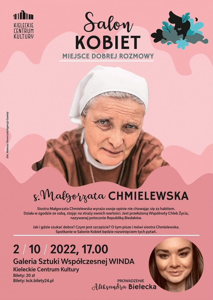 Siostra Małgorzata Chmielewska wyraża swoje opinie nie chowając się za habitem. Działa w zgodzie ze sobą, stojąc na straży swoich wartości. Jest przełożoną Wspólnoty Chleb Życia, nazywanej potocznie Republiką Biedaków. Jak i gdzie szukać dobra? Czym jest szczęście? O tym pisze i mówi siostra Chmielewska. Spotkanie w Salonie Kobiet będzie rozwinięciem tych pytań.*******