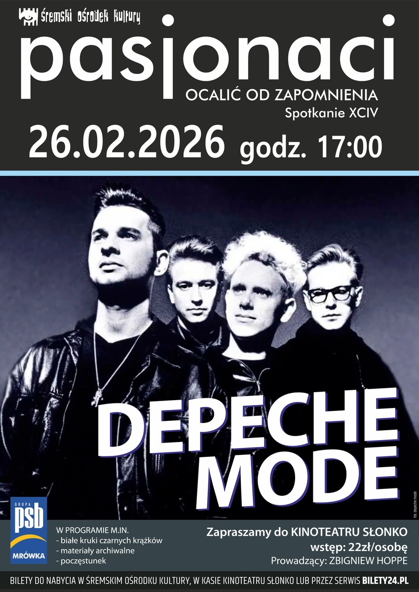 Pasjonaci. Ocalić od zapomnienia - Depeche Mode - brytyjska grupa muzyczna z kręgu muzyki elektronicznej i alternatywnego rocka, która powstała w 1980 w Basildon w Wielkiej Brytanii. Członkami zespołu pozostają Dave Gahan (wokal) i Martin Gore (klawisze, gitara elektryczna i wokal). Moderatorem spotkania jest Zbigniew Hoppe. Bilety w cenie 22 zł do nabycia: - w BOK ŚOK - w kasie Kinoteatru Słonko - poprzez serwis Bilety24.pl*******