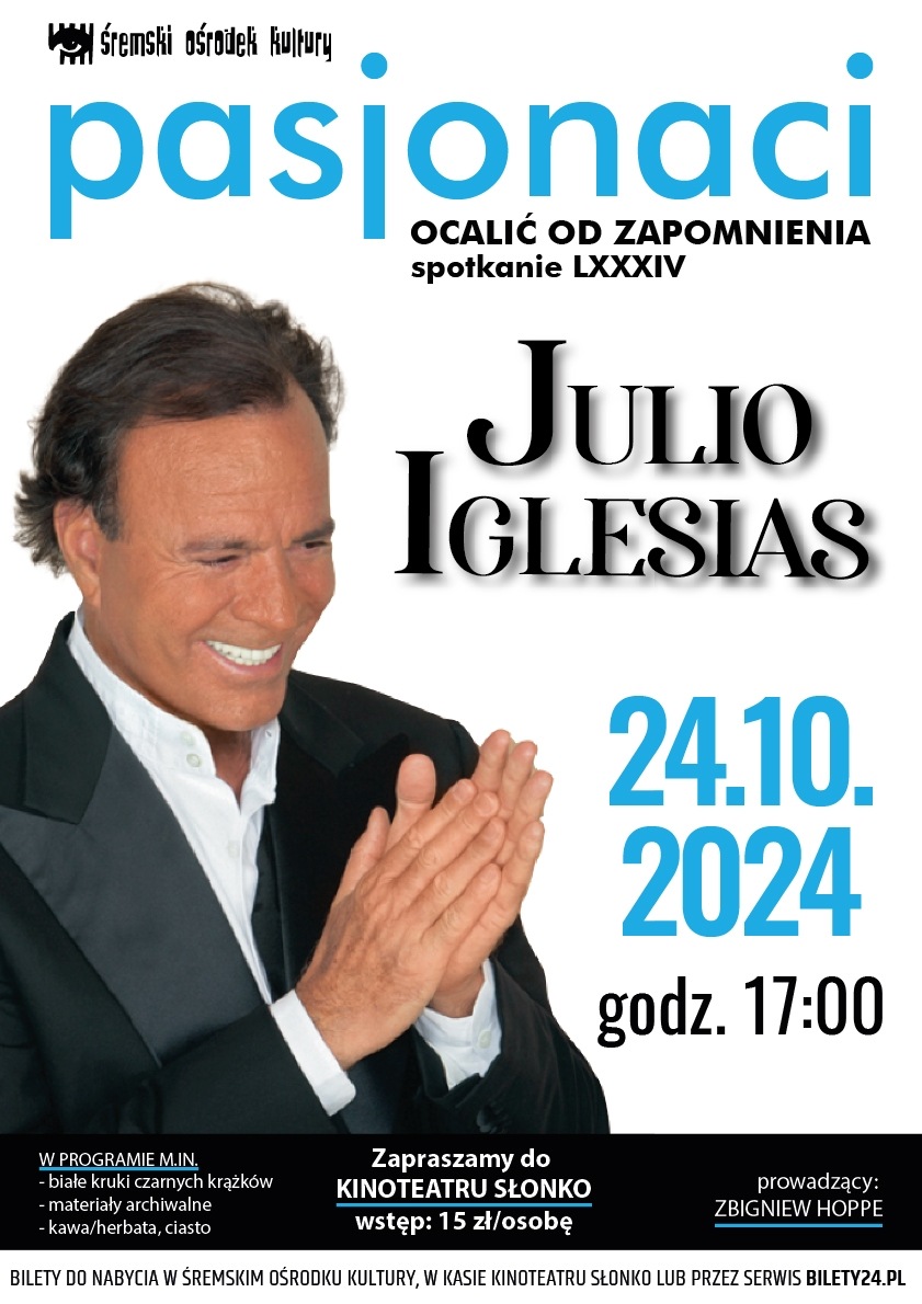 Julio Iglesias - hiszpański piosenkarz i kompozytor, którego romantyczny wizerunek, magnetyczna osobowość sceniczna i ekspresyjna muzyka uczyniły go jednym z najlepiej sprzedających się artystów muzyki w historii. Otrzymał łącznie około 2600 złotych i platynowych płyt. W trakcie swojej działalności muzycznej wydał ponad 77 albumów. Moderatorem spotkania jest Zbigniew Hoppe. Bilety w cenie 15 zł do nabycia: - w BOK ŚOK - w kasie Kinoteatru Słonko - poprzez serwis Bilety24.pl*******