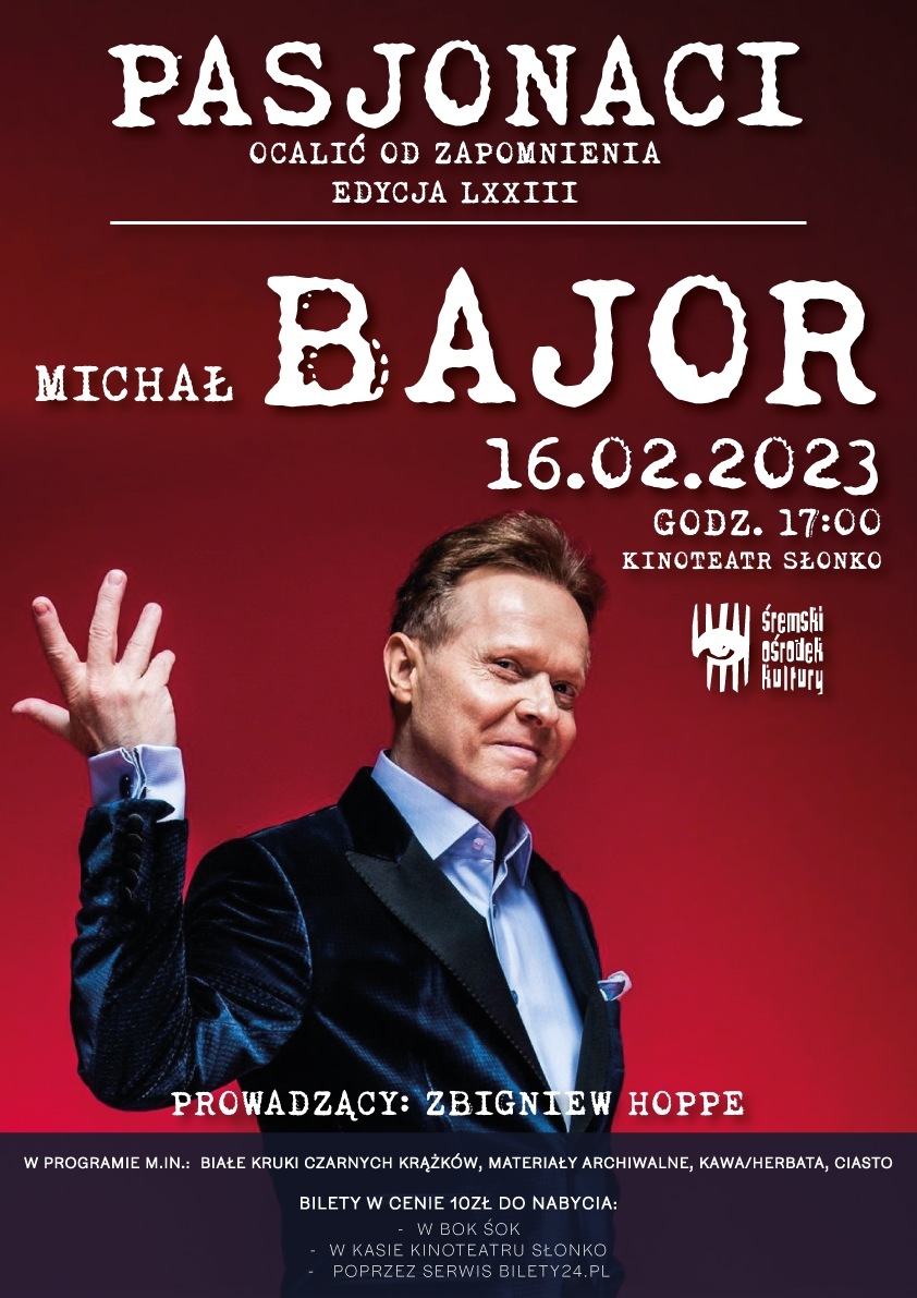„Pasjonaci. Ocalić od zapomnienia” Tym razem wspominać będziemy polskiego piosenkarza i aktora - MICHAŁA BAJORA. Artysta znany z takich przebojów, jak: „Moja miłość największa”, „Taka miłość w sam raz”, „Nie Chce Więcej”. Prowadzący Zbigniew Hoppe. Bilety w cenie 10 zł do nabycia: - w BOK ŚOK - w kasie Kinoteatru Słonko - poprzez serwis Bilety24.pl*******