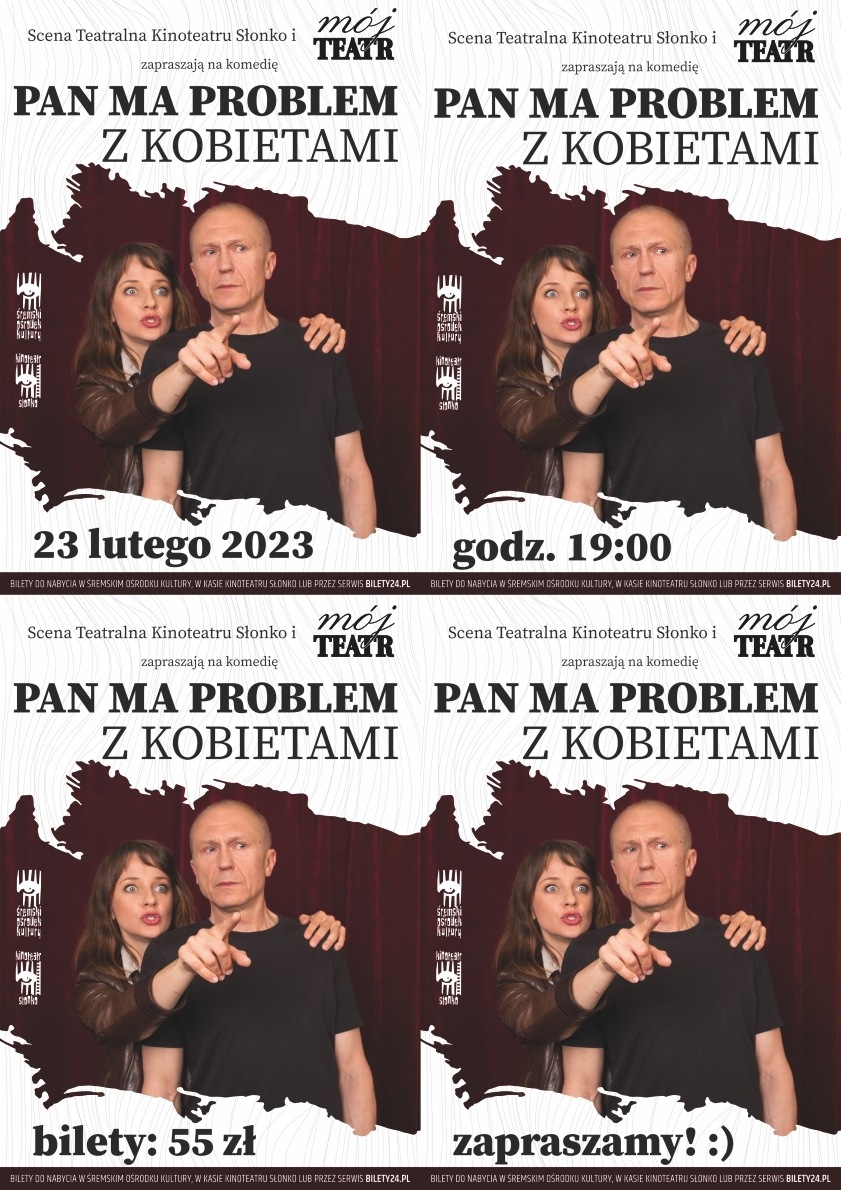 Scena teatralna Kinoteatru Słonko i Mój Teatr zapraszają na komedię pt. "Pan ma problem z kobietami", która odbędzie się 23 lutego 2023 r. o godz.19:00.