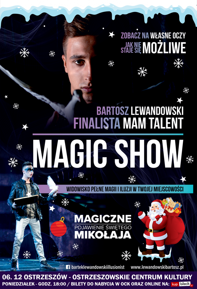Magic Show to godzinne widowisko magii i iluzji przeznaczone dla dzieci, młodzieży i dorosłych. Podczas widowiska widzowie przeniosą się w magiczną podróż, a niemożliwe na oczach całej publiczności stanie się możliwe! Głównym punktem programu będą triki z ptakami, którymi Bartosz Lewandowski podbił 11 edycję telewizyjnego "Mam Talent"! To jedne z głównych atrakcji występów Bartosza, które zachwyciły tysiące widzów przed telewizorami w całym kraju! Jednak to nie koniec atrakcji jakie jeszcze na Was czekają! Nie zabraknie sporej dawki śmiechu, którą dostarczy kabaretowo-magiczna część widowiska. Przepowiednie, etiuda z latającym stolikiem, pojawiające i znikające przedmioty, manipulacje, duże iluzje w asyście pięknej śnieżynki oraz wiele innych magicznych urozmaiceń!