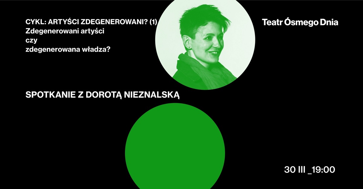 Zdegenerowani artyści czy zdegenerowana władza? Spotkanie z Dorotą Nieznalską Sztuka wolnych ludzi zawsze będzie uwierać władzę dążącą do autorytaryzmu. Rządzący nie potrzebują twórczej narracji, tylko prostej propagandy – dlatego atakują artystów. Wszystko co podaje w wątpliwość ich model patriotyczno–narodowej magmy, określane jest jako niebezpieczne, wrogie Polsce i jej mieszkańcom. Niezależni twórcy mimo to działają, zadają pytania, diagnozują i oceniają naszą rzeczywistość. W Teatrze Ósmego Dnia będziemy rozmawiać z tymi artystami, których rządzący nazywają artystami zdegenerowanymi. Robią to wprost, jak w przypadku ministra Glińskiego, który tym mianem określił reżysera Wojciecha Smarzowskiego, robią to też przez sieć opresji państwowej...