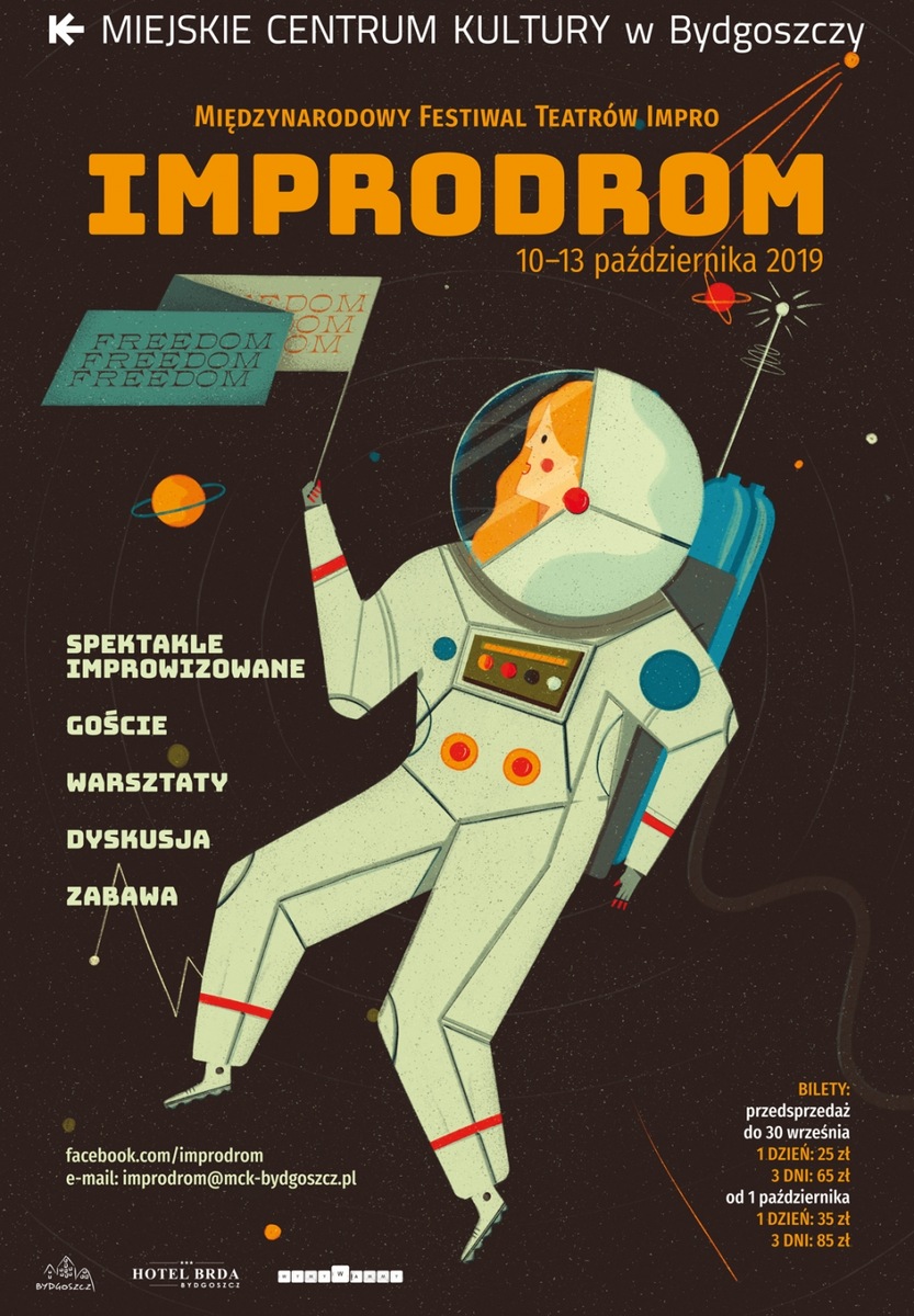 Międzynarodowy Festiwal Teatrów Impro IMPRODROM organizowany przez Miejskie Centrum Kultury w Bydgoszczy i działający w nim Teatr Improwizowany wymyWammy poświęcony jest niezwykłej formie teatralnej jaką jest improwizacja. Wszystkie spektakle zaprezentowane podczas Improdromu tworzone są na oczach widzów!!! Publiczność ma wyjątkową szansę uczestniczyć w procesie kreacji i wpływać na kształt przedstawień. Tegoroczna edycja jest szóstą odsłoną Festiwalu. Z każdym rokiem międzynarodowy wymiar festiwalu rośnie w siłę. Obok teatrów impro z Polski, na scenie MCK wystąpią improwizatorzy z innych krajów, jedni z najbardziej szanowanych i utalentowanych improwizatorów na świecie. W tym roku gościć będziemy w MCK improwizatorów z 14 różnych krajów! Improdrom...