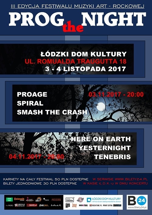 W dniach 3-4 listopada 2017 w Łódzkim Domu Kultury (ul. Traugutta 18) odbędzie się trzecia edycja festiwalu PROG the NIGHT. Wystąpią przedstawiciele art rockowego nurtu w Polsce: I DZIEŃ PROAGE SPIRAL SMASH THE CRASH II DZIEŃ HERE ON EARTH YESTERNIGHT TENEBRIS *******