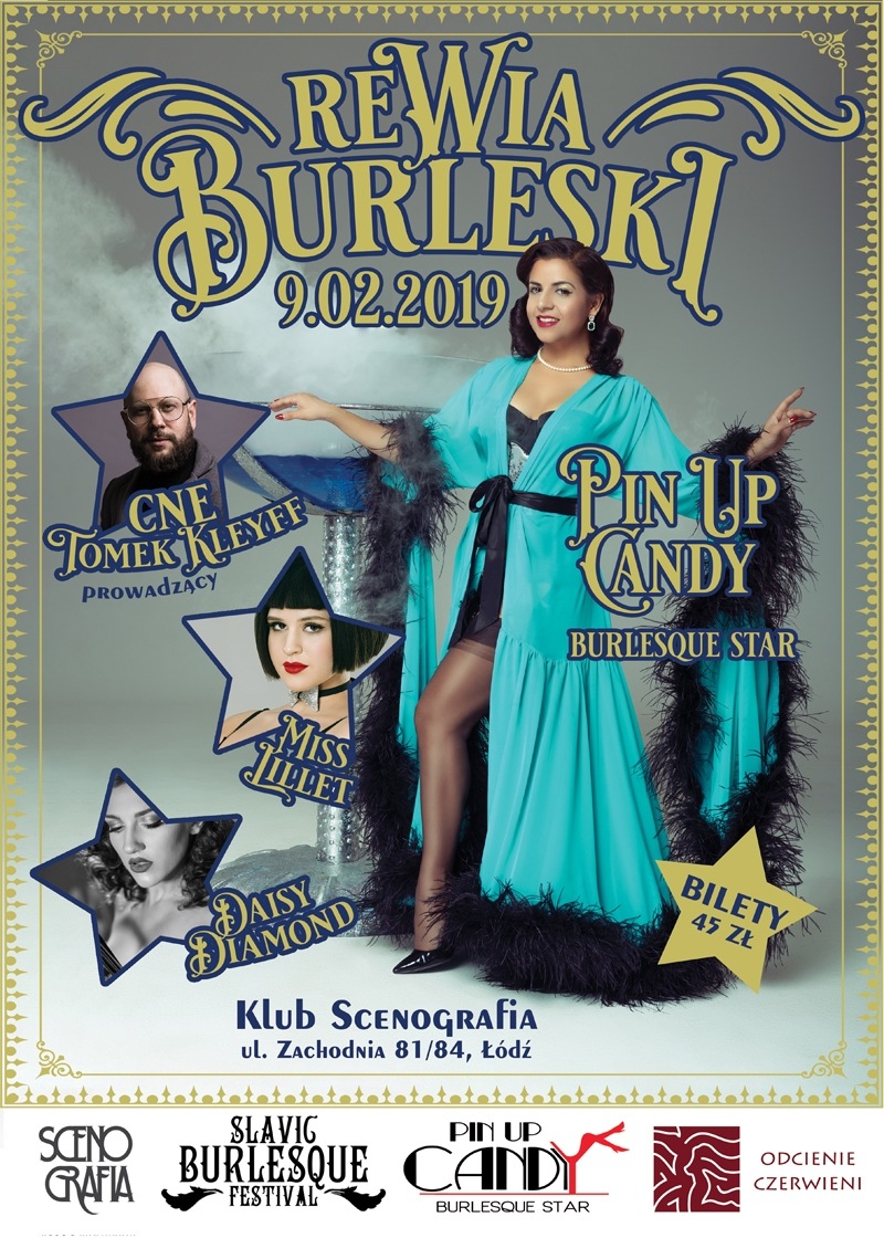 Rewia Burleski - Pin Up Candy - Łódź 09.02.2019 Najlepsza dawka brokatu, piór i rozrywki w stylu retro! Do klubu Scenografia wraca Rewia Burleski z Pin Up Candy na czele. Po sukcesie zeszłorocznej edycji wracamy do Was w nowym składzie z niesamowitymi pokazami. Na scenie klubu wystąpi plejada polskich performerów: Pin Up Candy - Królowa Polskiej Burleski, półfinalistka Mam Talent, zdobywczyni korony na festiwalu burleski w Moskwie, prekursorka tej sztuki w Polsce i ambasadorka stylu retro i pin-up! Obok niej wystąpią diamenty sceny burleski w Polsce Miss Lillet, długonoga baletnica, która swoimi pokazami zahipnotyzuje całą publiczność. Daisy Diamond - profesjonalna tancerka, która łączy w swych pokazach miłość do stylu retro i współczesną...