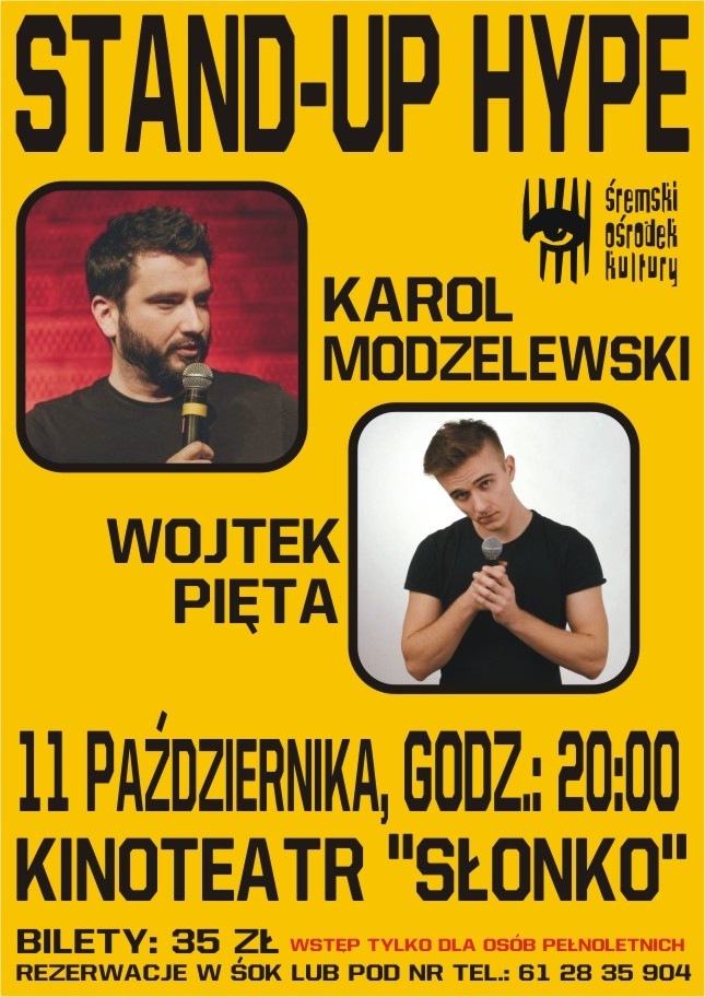 Z przyjemnością zapraszamy na wieczór ze stand-up'em STAND-UP HYPE, który odbędzie się 11 października o godz.: 20:00 w Kinoteatrze "Słonko". Tym razem dla śremian wystąpią: Wojtek Pięta i Karol Modzelewski. Wojtek Pięta - wystąpił na scenach każdego z większych miast w Polsce oraz w telewizji w programie Kuby Wojewódzkiego i Comedy Central. Uczestnik obu edycji Polskiej Ligi Stand-upu. Finalista Festiwalu Antrakt 2016. Brał udział w roastach: Tego Typa Mesa oraz Krzysztofa Skiby. Gospodarz krakowskiej sceny Stand-up w Bakałarzu, katowickiej i chorzowskiej Stand-up Silesia oraz Stand-up Tarnów. Autor kanału w serwisie youtube oraz improwizator sceniczny. W swoim nowym programie mówi o tym co dzieje się, gdy wcześniej brakło asertywności by...