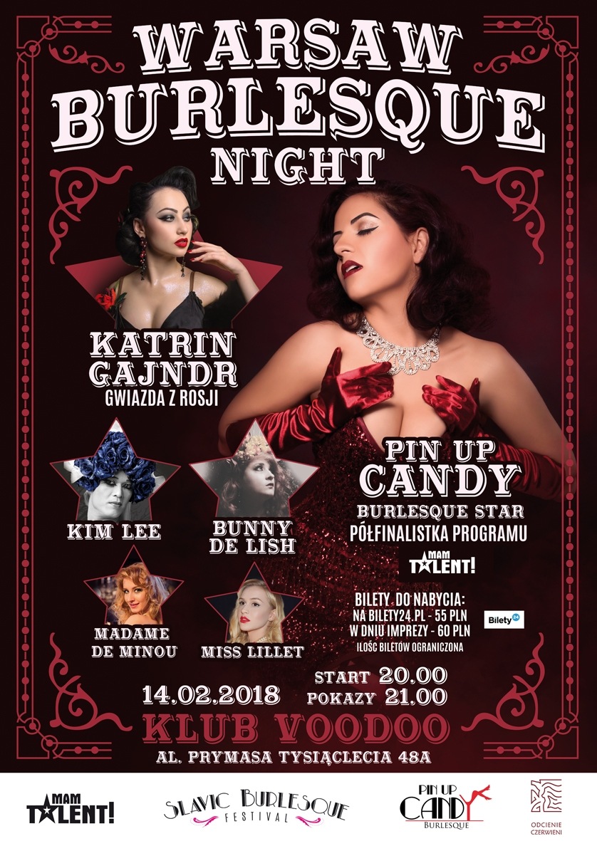 Warsaw Burlesque Nighjt vol. 8 St. Valentines Zastanawiacie się jak spędzić ten wyjątkowy wieczór? Zapraszamy na seksowne pokazy burleski, które pobudzą Wasze zmysły i pobudzą Was do przyjemnej kontynuacji wieczoru... Burleska to wyjątkowa sztuka, która mówić będzie do Was poprzez kobiecość i... nie tylko. Na scenie plejada performerów: Pin Up Candy Burlesque Star Katrin Gajndr Russian Burlesque Diva Kim Lee Bunny de Lish Madame de Minou - Burlesque Artist... Miss Lillet Specjalnie na ten wieczór przygotowaliśmy dla Was czerwone i miłosne pokazy. Start: 20:00 Start pokazów: 21:00 *******