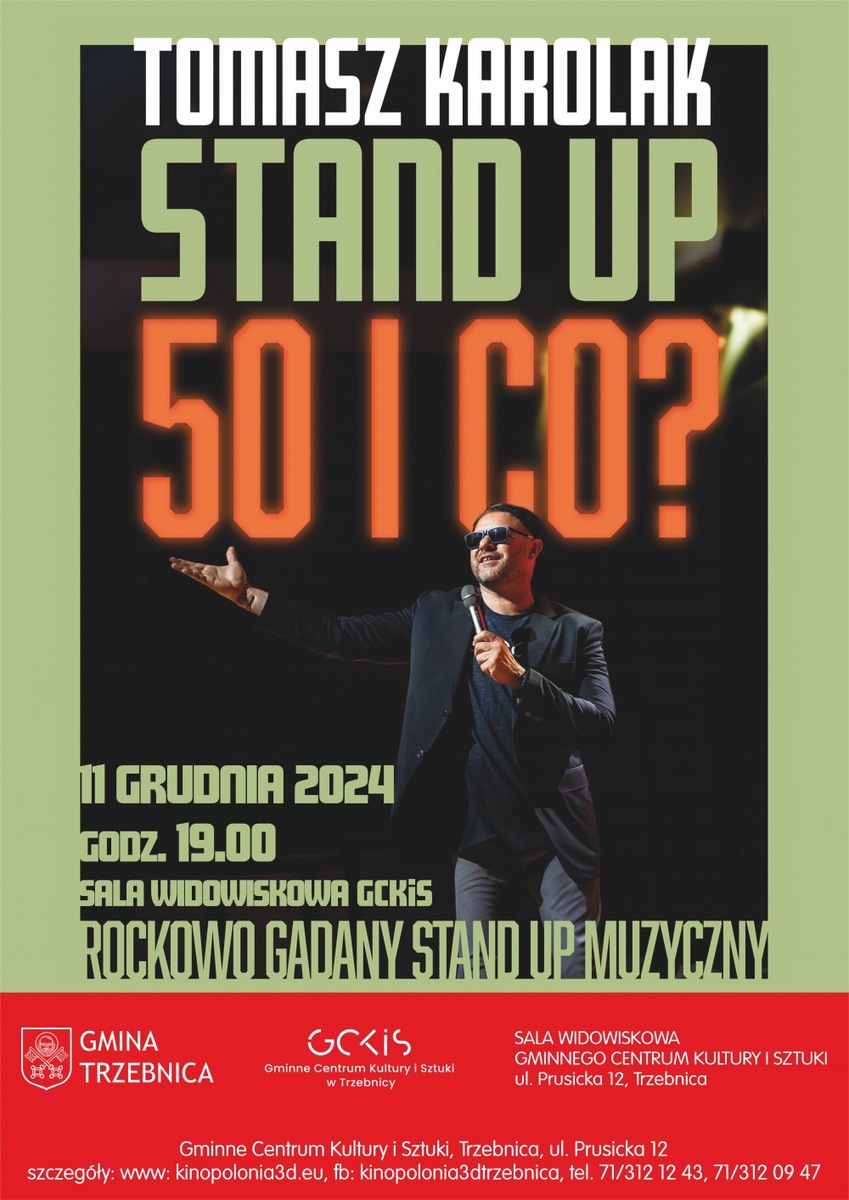Tomasz Karolak - "50 i co?" czyli muzyczne przygody Tomasza. Rockowo gadany stand up muzyczny. Najnowsze dziecko i autorski show Tomasza Karolaka, który jest podsumowaniem jego dotychczasowej drogi jako aktora ale również muzyka i wokalisty. Bogate życie artystyczne, skłoniło artystę do podzielenia się ze światem jego przeżyciami. Cięty a zarazem inteligentny i pozbawiony skrupułów, rockowy język Tomka, wprowadzi Was w świat show biznesu jakiego nie znacie. Stand up przedzielony piosenkami śpiewanymi na żywo przez Tomasza, które towarzyszą mu do tej pory w jego drodze artystycznej Czas trwania: 90 minut.*******