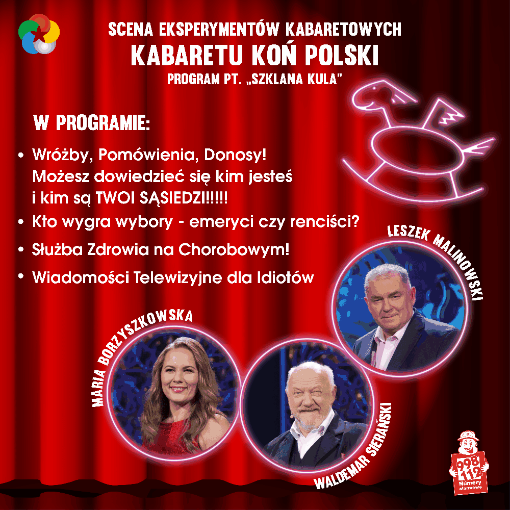 Szklana Kula – bo taki nosi tytuł najświeższy program Kabaretu Koń Polski – jak w soczewce skupia polską rzeczywistość. A co ujawni ponadto? Jaką pokaże przyszłość? Czy choć trochę powieje optymizmem? Przekonacie się już niebawem. A wszystko przy udziale zjawisk metafizycznych, nieznanych dotąd współczesnej nauce. Kabaret występuje już ponad ćwierć wieku, a karierę rozpoczął od zdobycia Grand Prix na I Przeglądzie Kabaretów Paka w Krakowie. Potem były „Złota Szpilka” Lidzbarskich Biesiad Satyry i Humoru i wiele, wiele innych. Kabaret ma na koncie dwa seriale telewizyjne – Badziewiakowie i Skarb Sekretarza. Jest gospodarzem największej imprezy kabaretowej w kraju – Festiwalu Kabaretu w Koszalinie odbywającego się co roku w ostatnią sobotę lipca,...